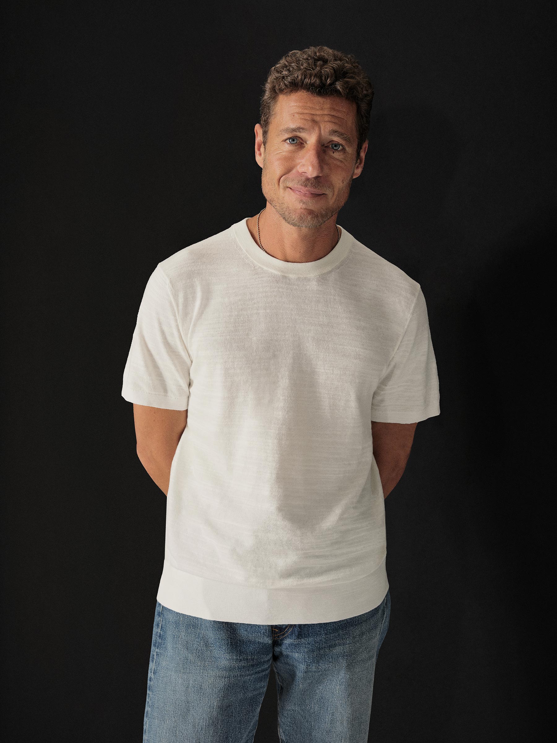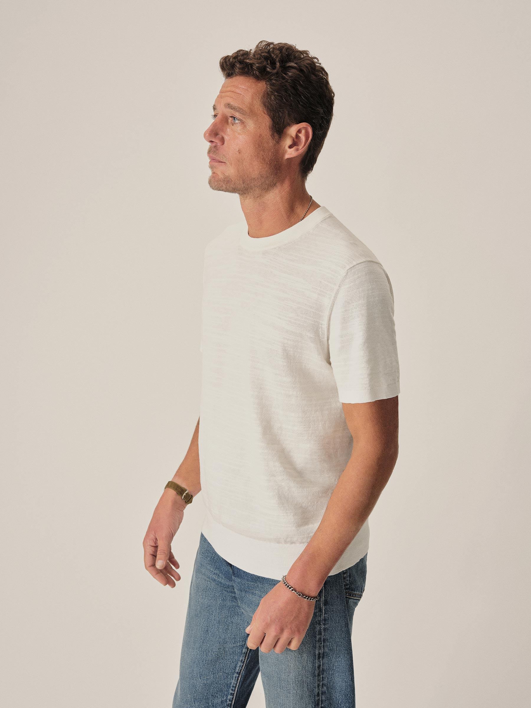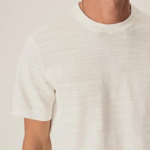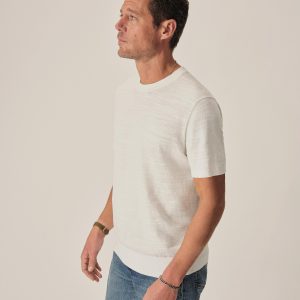 Classic fit short sleeve sweater tee with a straight hem. Yarn-dyed 16 gauge cotton jersey features light slub texture. Features double layer 1×1 ribbing at the collar and rib finishing at the cuffs and hem. Constructed with hand-linked seams for improved durability.