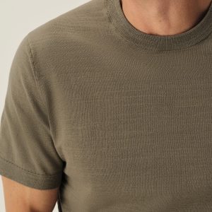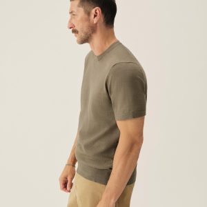 Classic fit short sleeve sweater tee with a straight hem. Yarn-dyed 16 gauge cotton jersey features light slub texture. Features double layer 1×1 ribbing at the collar and rib finishing at the cuffs and hem. Constructed with hand-linked seams for improved durability.