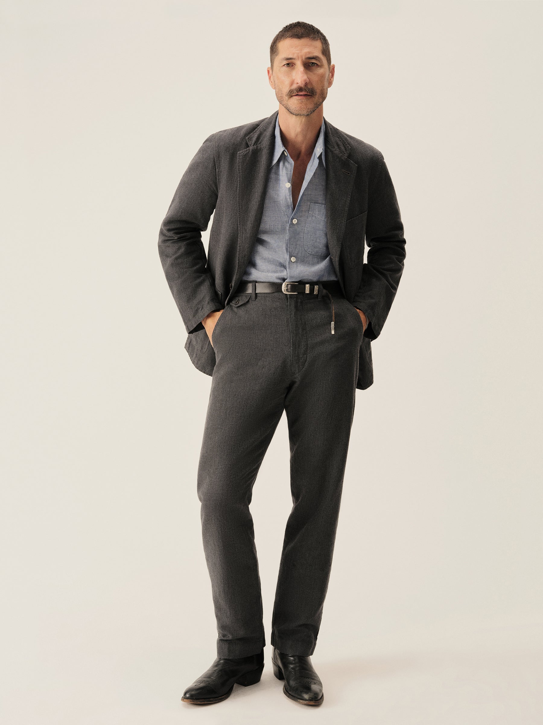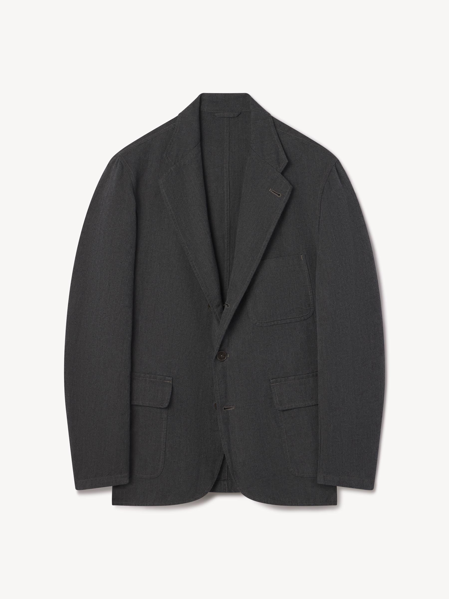 The Carry On Jacket is designed to be casual enough to wear by itself or step up into a full suit with matching trousers. It’s constructed with a classic three-roll, two-button stance with a welt chest pocket and two patch-and-flap pockets at the hip. With no lining or back vent, the jacket is decidedly casual and streamlined. This iteration is made from a light and breathable blend of cotton and linen with a subtly textured herringbone weave.