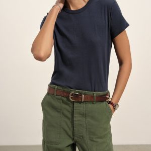 Slim fit crewneck tee cut from a supersoft 130 GSM blend of bamboo, cotton, and wool. Features a straight hem, a self bound neck, and raised armholes that hug the contours of the shoulders. Garment washed for a lived-in feel.
