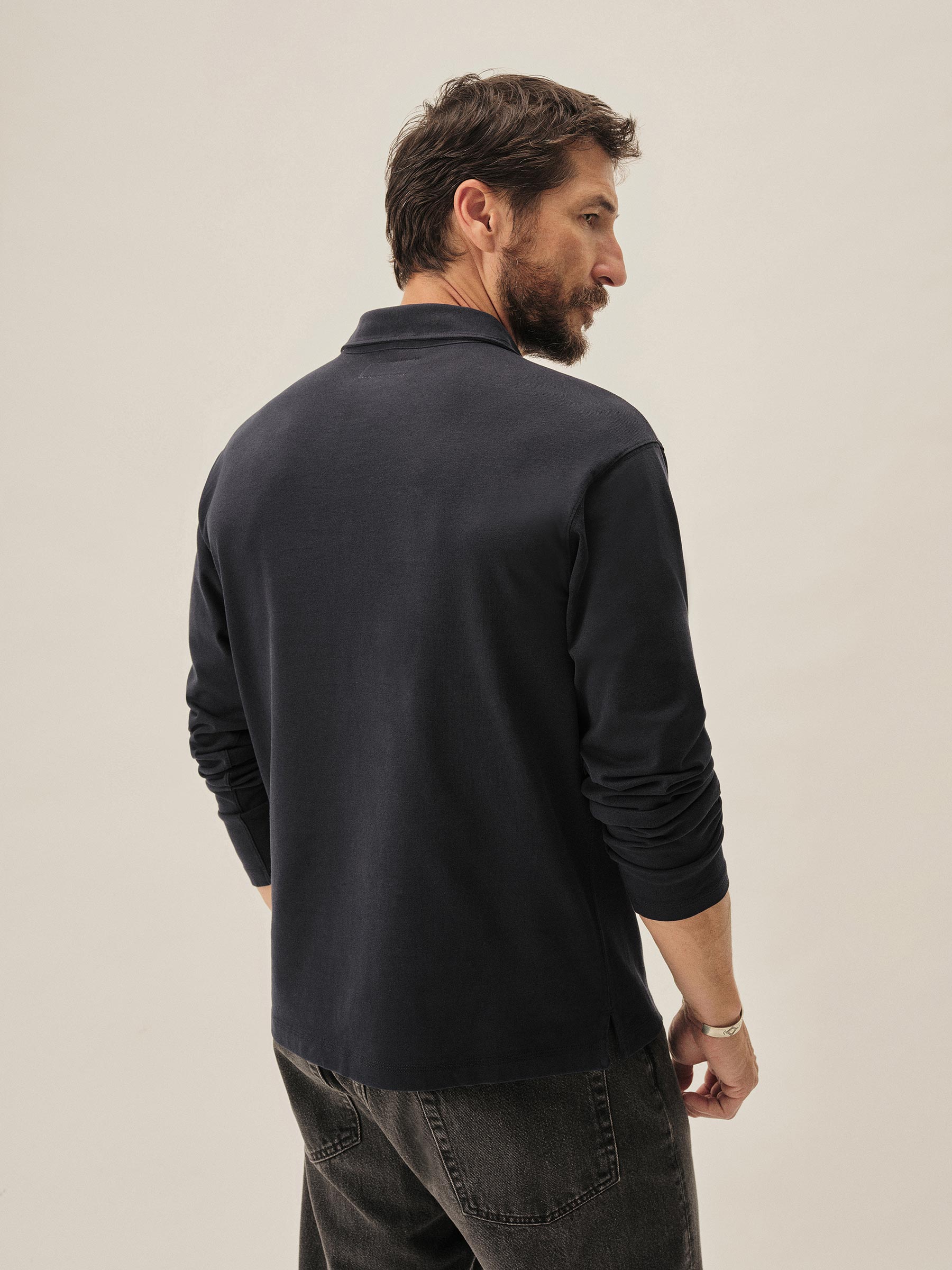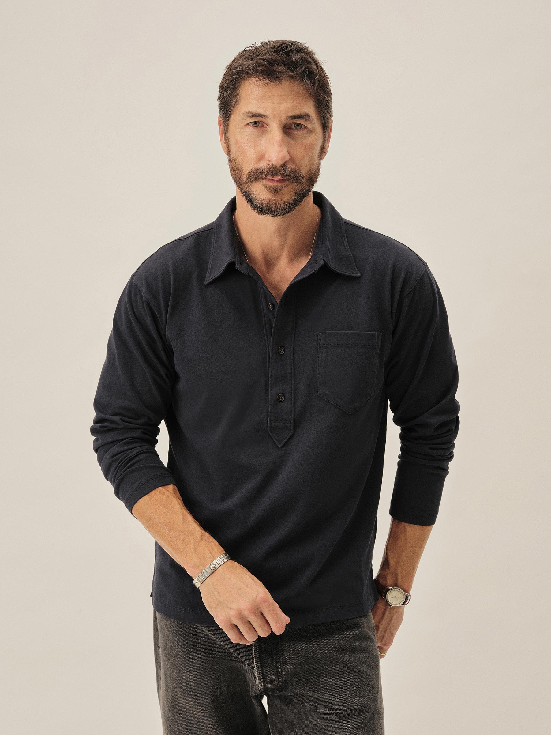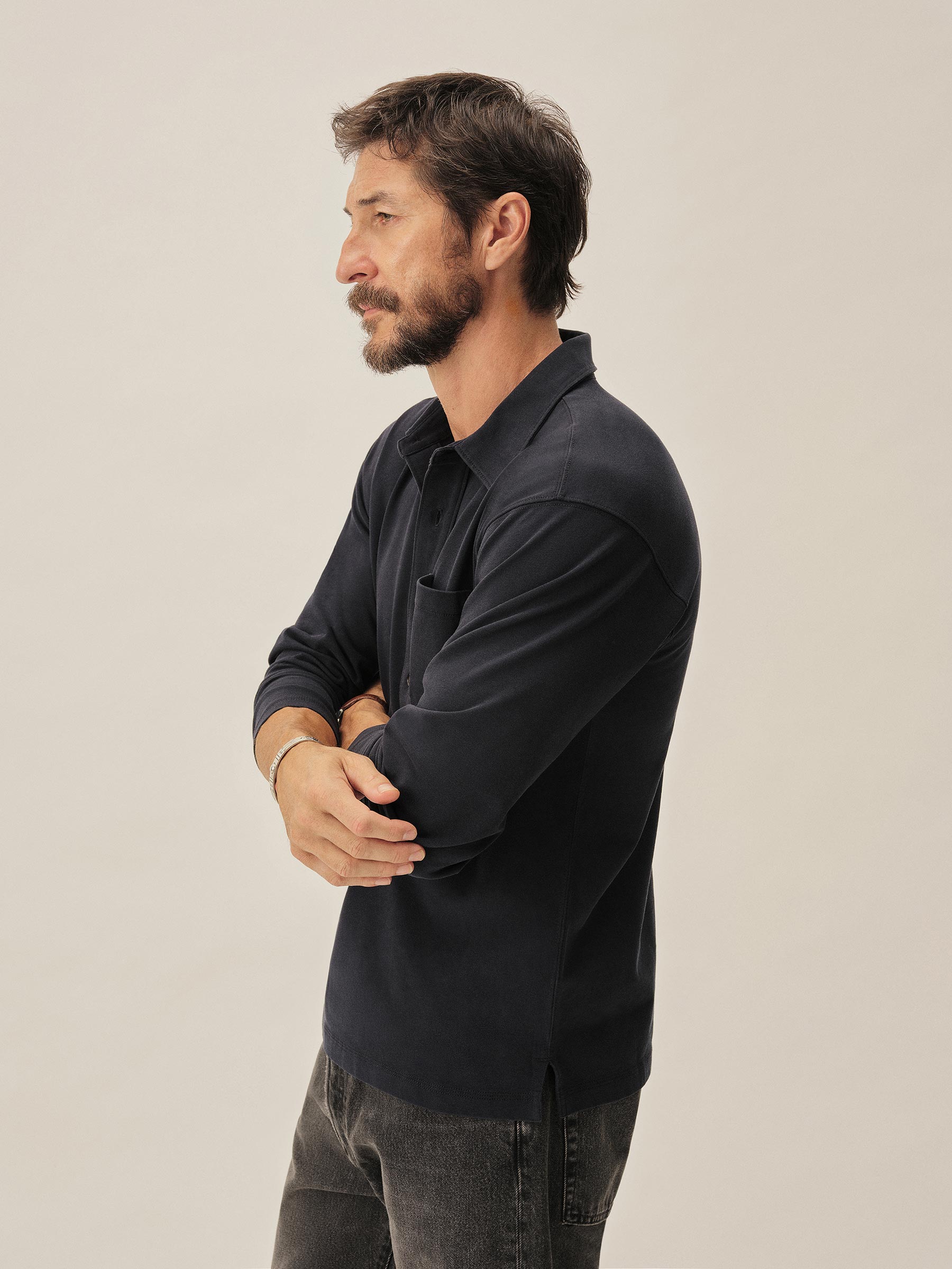 A popover shirt made from a midweight compact cotton jersey with a smooth, uniform texture and cool hand. It features a traditional shirt collar with a four-button half placket and single chest pocket. Ribbed sleeve cuffs.