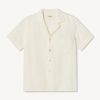 Oversized short-sleeve camp collar shirt with a cropped body, cut from a 100% linen weave. Featuring a low neckline, two front chest pockets, notched vents at sides, and a back yoke to box pleat. Finished with oversized mother of pearl buttons for a luxe, polished summer look. Garment washed for a lived-in look and feel.