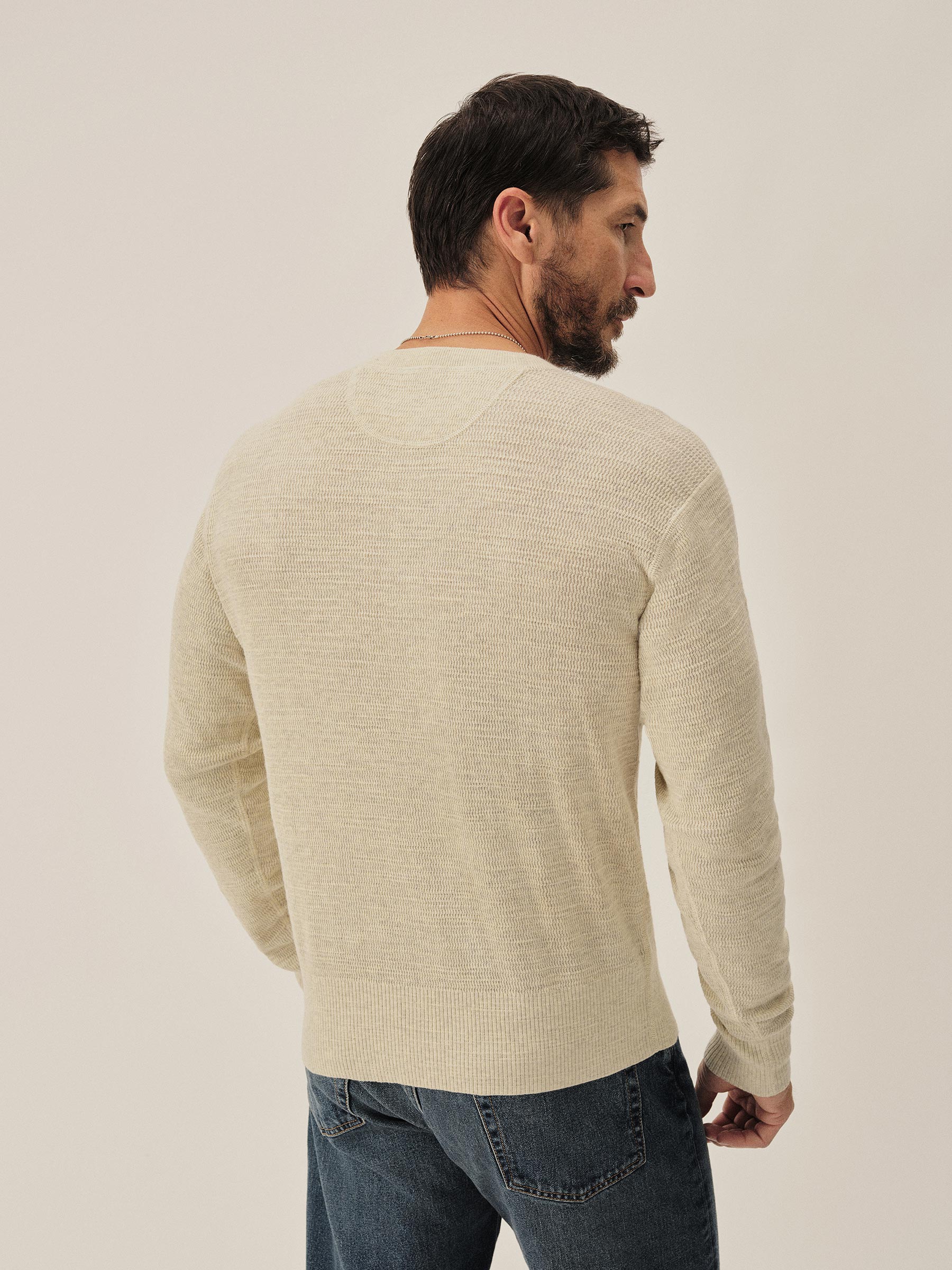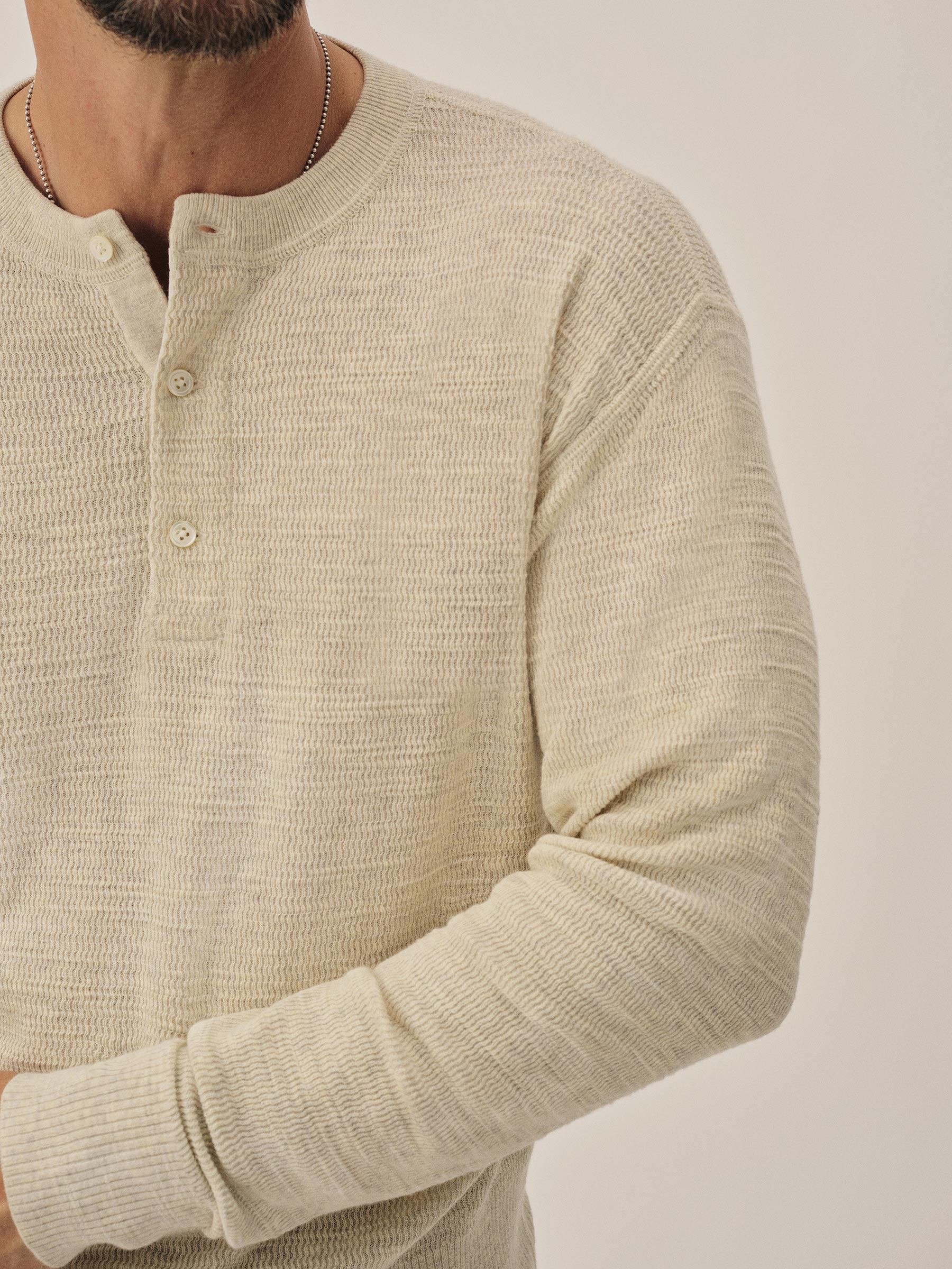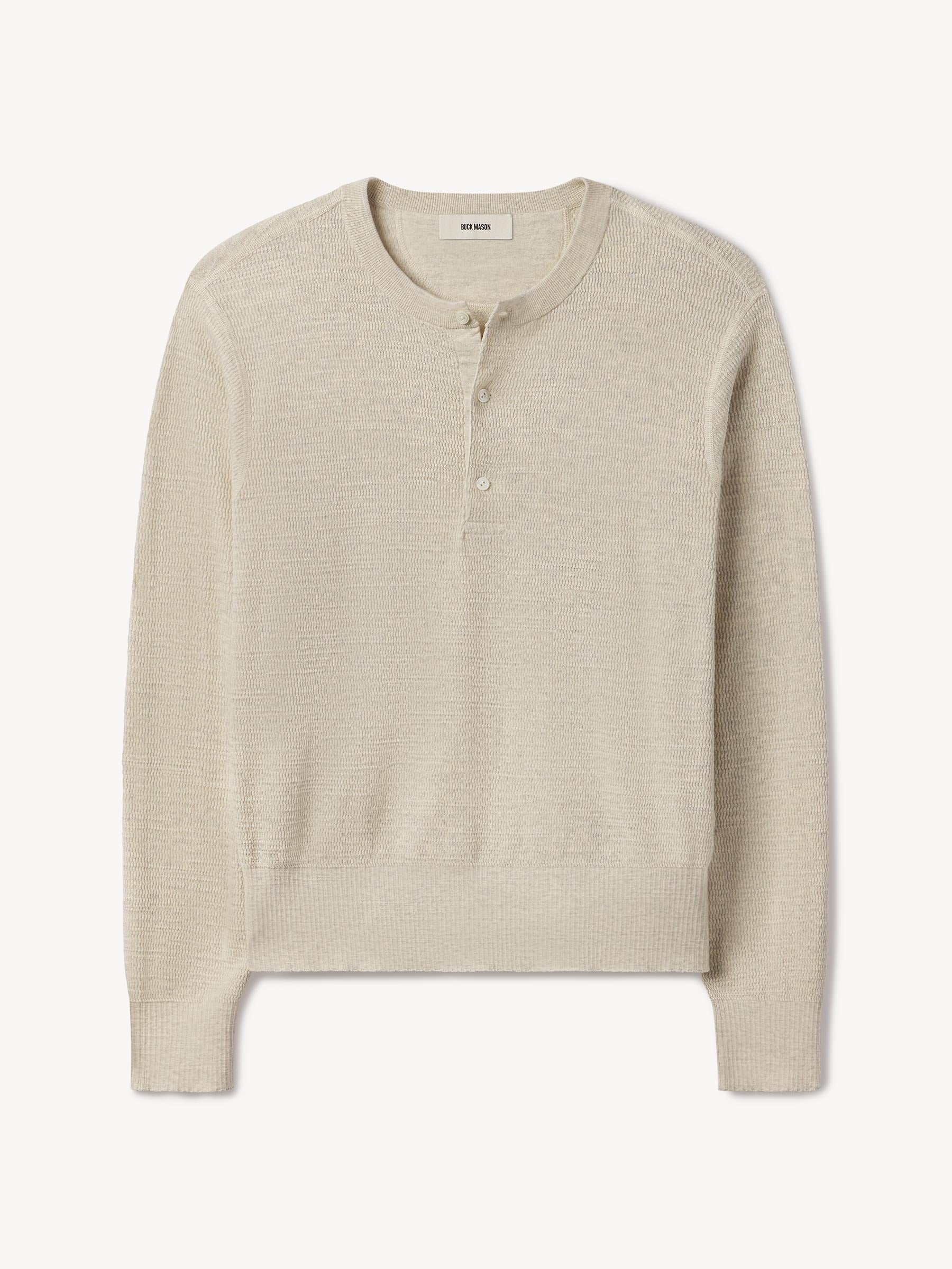 A standard fit, vintage-inspired thermal stitch henley crafted from slubby, yarn-dyed cotton. Featuring variegated rib finishes at the cuffs and bottom hem, and coverstitching along the seams. Finished with a three button shell closure.
