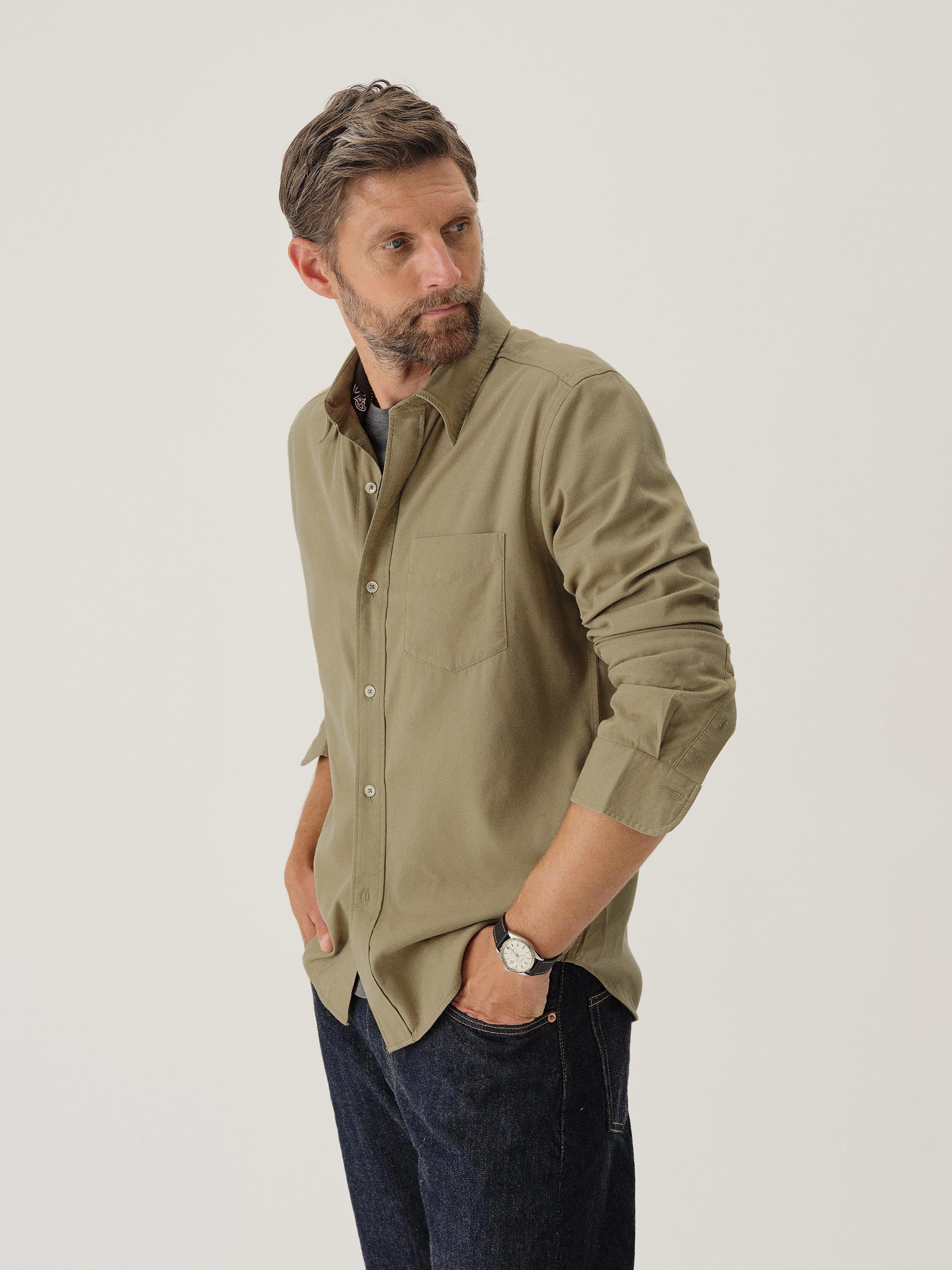 Slim fit long sleeve button up shirt in 5.25 oz. cotton/rayon twill with a subtle luster and an easy drape. Details include mother of pearl buttons, a single spade pocket at the chest, and a box pleat at the back yoke. Constructed with single needle topstitch detailing with double needle stitching at the collar and cuffs. Garment washed with softener for a lived-in feel.
