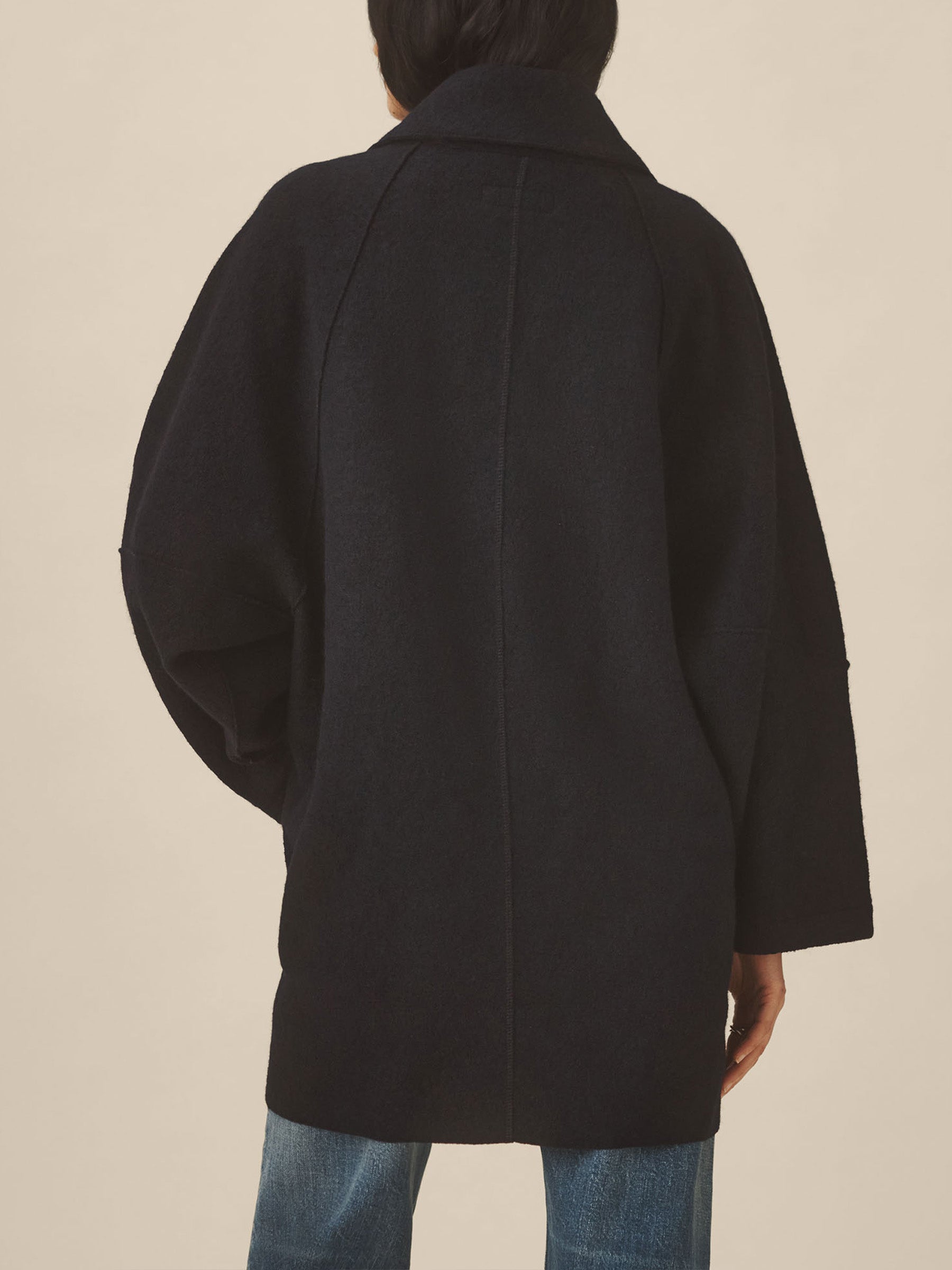Relaxed fit blanket coat with room through the arms and torso for layering. This 340 GSM felted merino wool has been twice boiled for improved insulation and durability. Details include two front patch pockets and a notch lapel collar. Fully unlined construction with lapped seams throughout for a beautiful, natural drape.