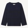 Nautical-inspired boxy fit short sleeve wide neck tee with a straight hem, longer sleeve length, drop shoulder, high neck, and wide ribbed collar. The soft cotton jersey, yarn-dyed in indigo and black sulfur stripe pattern, is about twice as heavy as our Pima tees, with tiny vertical ribs that gently glide across the skin. This is a solid, substantial stand-alone tee for cold weather that will pick up a ton of character over time.