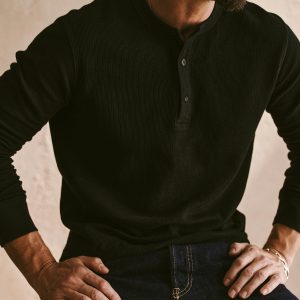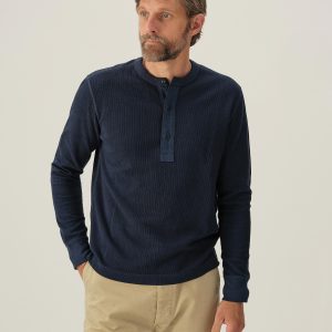 Nautical-inspired boxy fit short sleeve wide neck tee with a straight hem, longer sleeve length, drop shoulder, high neck, and wide ribbed collar. The soft cotton jersey, yarn-dyed in indigo and black sulfur stripe pattern, is about twice as heavy as our Pima tees, with tiny vertical ribs that gently glide across the skin. This is a solid, substantial stand-alone tee for cold weather that will pick up a ton of character over time.