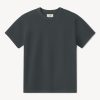 Nautical-inspired boxy fit short sleeve wide neck tee with a straight hem, longer sleeve length, drop shoulder, high neck, and wide ribbed collar. The soft cotton jersey, yarn-dyed in indigo and black sulfur stripe pattern, is about twice as heavy as our Pima tees, with tiny vertical ribs that gently glide across the skin. This is a solid, substantial stand-alone tee for cold weather that will pick up a ton of character over time.