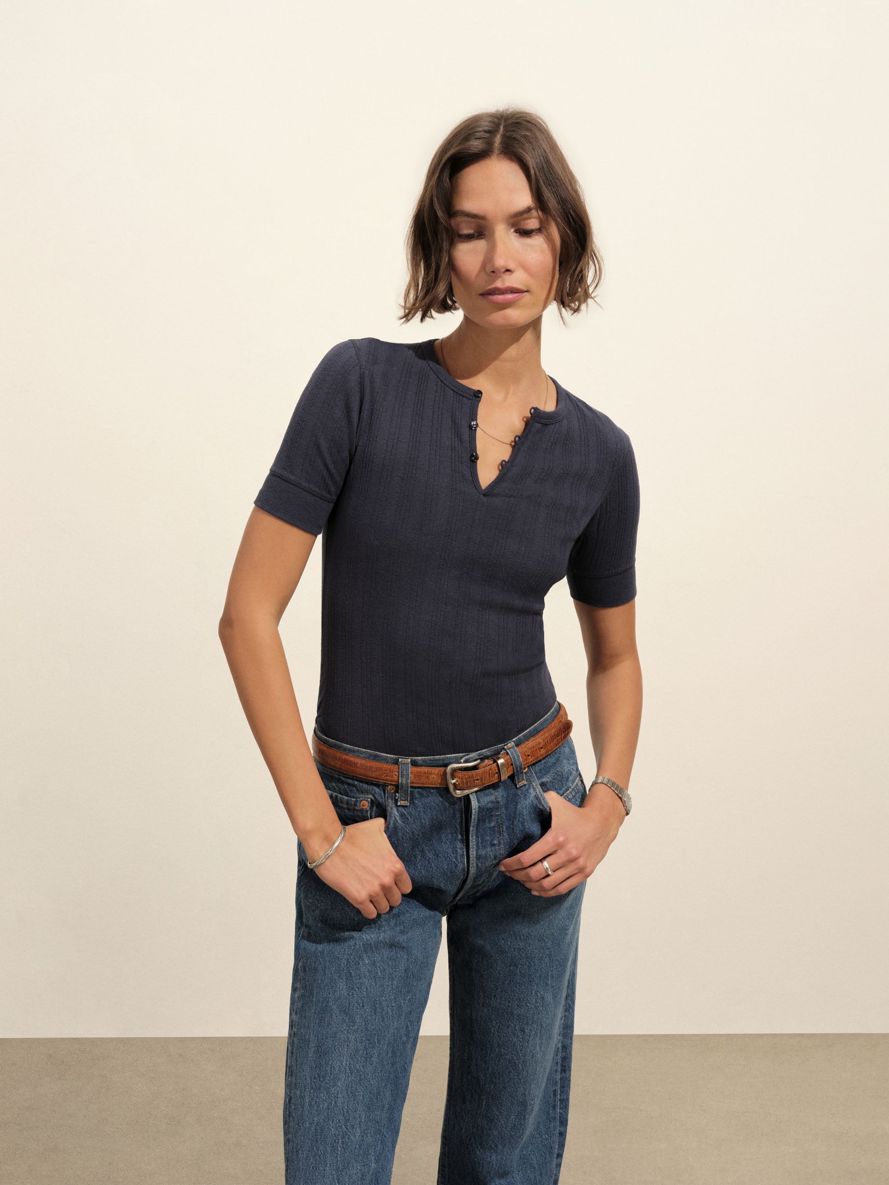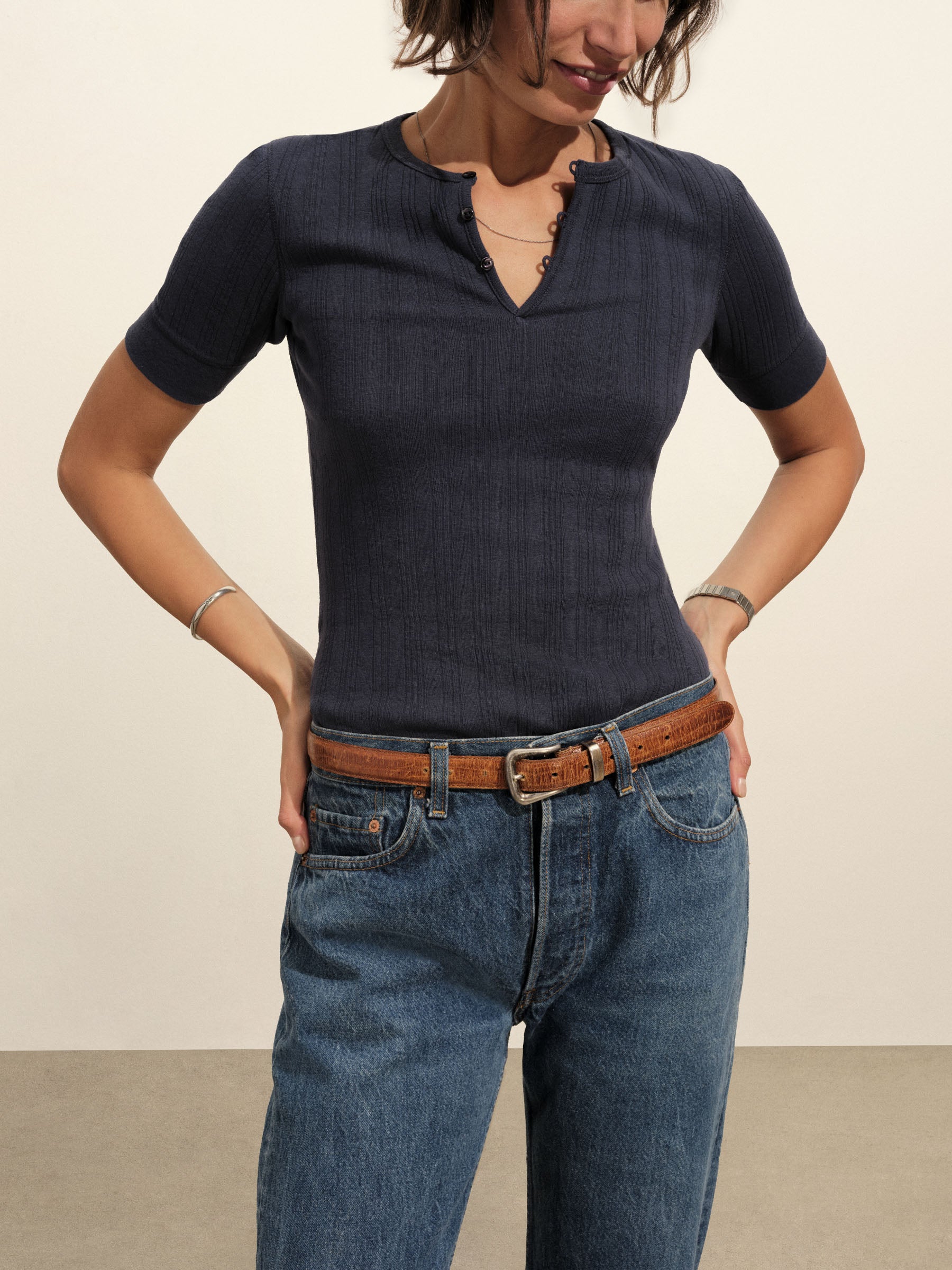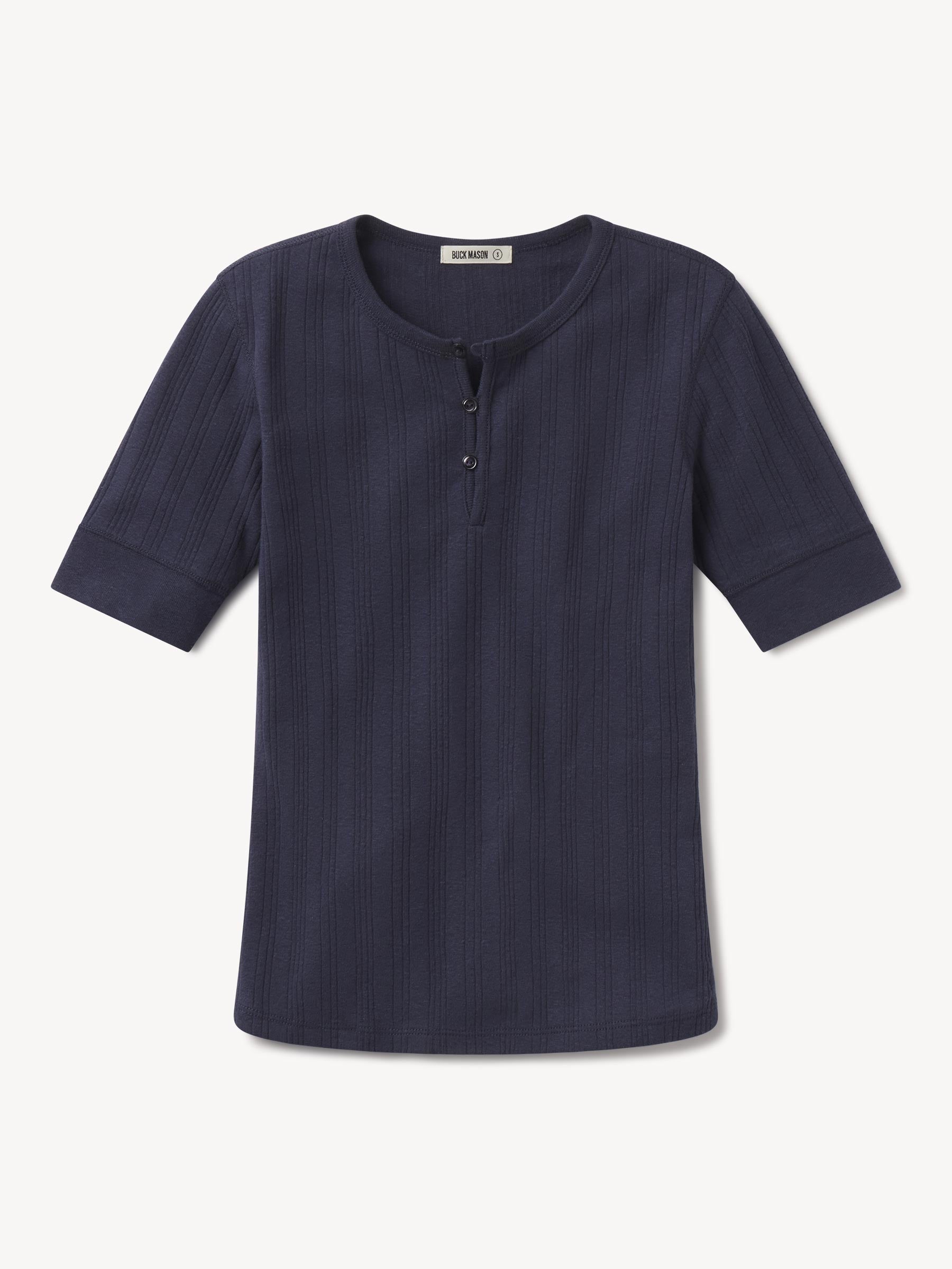 Military-inspired short sleeve henley, crafted from a superfine blend of new and recycled cotton with a subtle, textured rib. Featuring a three-button loop placket and sleeve cuffs. Finished with mother of pearl buttons and garment washed for a lived-in feel.