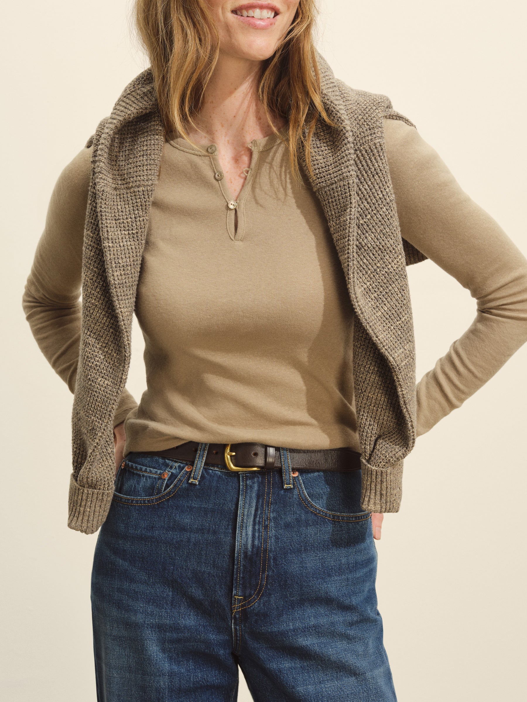 “Slim fit long sleeve henley cut from extra fine 170 GSM cotton with recycled content that holds its shape. Details include a a three-button loop placket with corozo fish eye buttons, and straight, clean finished hem and cuffs. Garment washed for a lived-in feel.