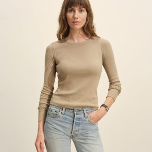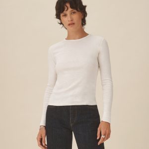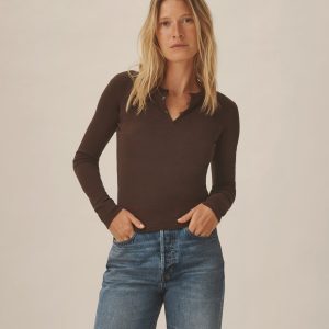 “Slim fit long sleeve henley cut from extra fine 170 GSM cotton with recycled content that holds its shape. Details include a a three-button loop placket with corozo fish eye buttons, and straight, clean finished hem and cuffs. Garment washed for a lived-in feel.