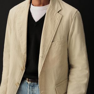 Tailored 3-roll-2 button blazer inspired by timeless vintage suiting. This 5 oz cotton seersucker has a rippled texture that wicks moisture and maintains airflow making it ideal for warmer climates. Details include two patch pockets, two internal welt pockets, and a notched lapel. We left it unlined and omitted the back vent and cuff buttons for a casual, streamlined look. Constructed with hand-linked seams and garment washed with enzymes and softener for a lived-in feel.