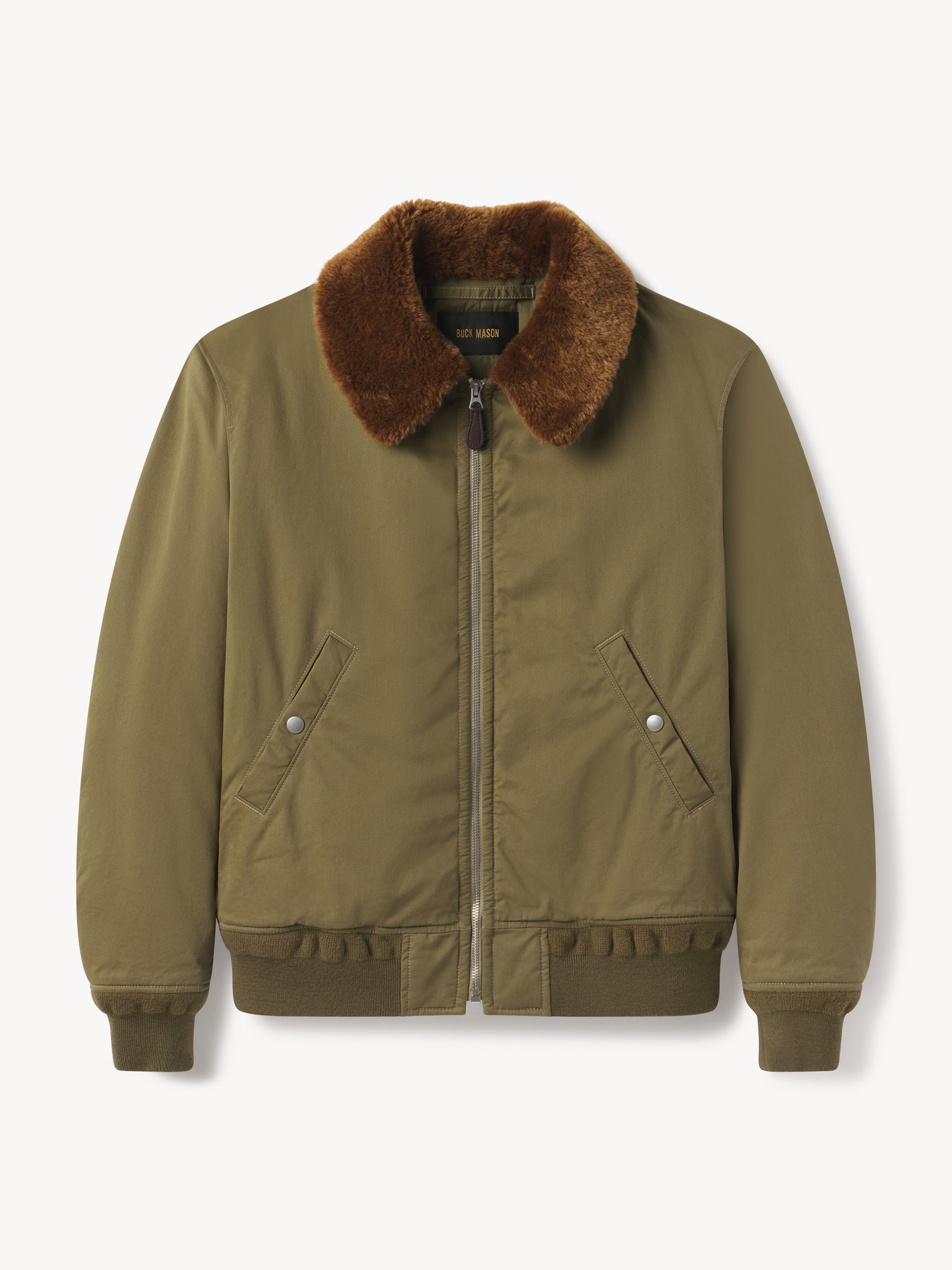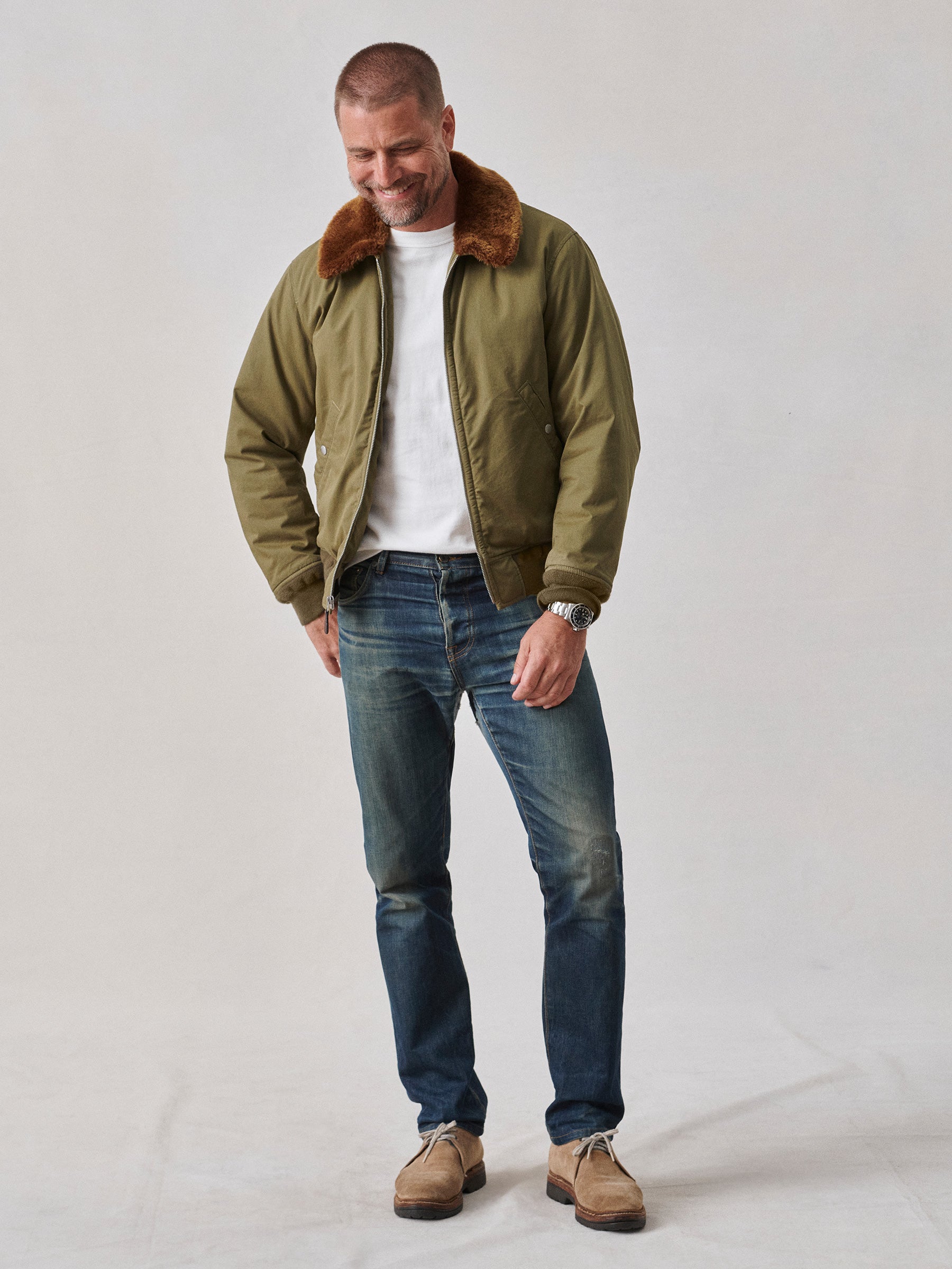 In 1944, the B-15 jacket became standard issue for the USAAF. We’ve brought it into the 21st century with a premium weather cloth we developed with Olmetex in Italy, blending a premium finish with all-weather performance. Filled with PrimaLoft insulation, it’s finished with a shearling collar, corozo-buttoned throat latch, enamel-coated snap front pockets, interior welt pocket, die-cast zip front closure, and rib cuff and hem.