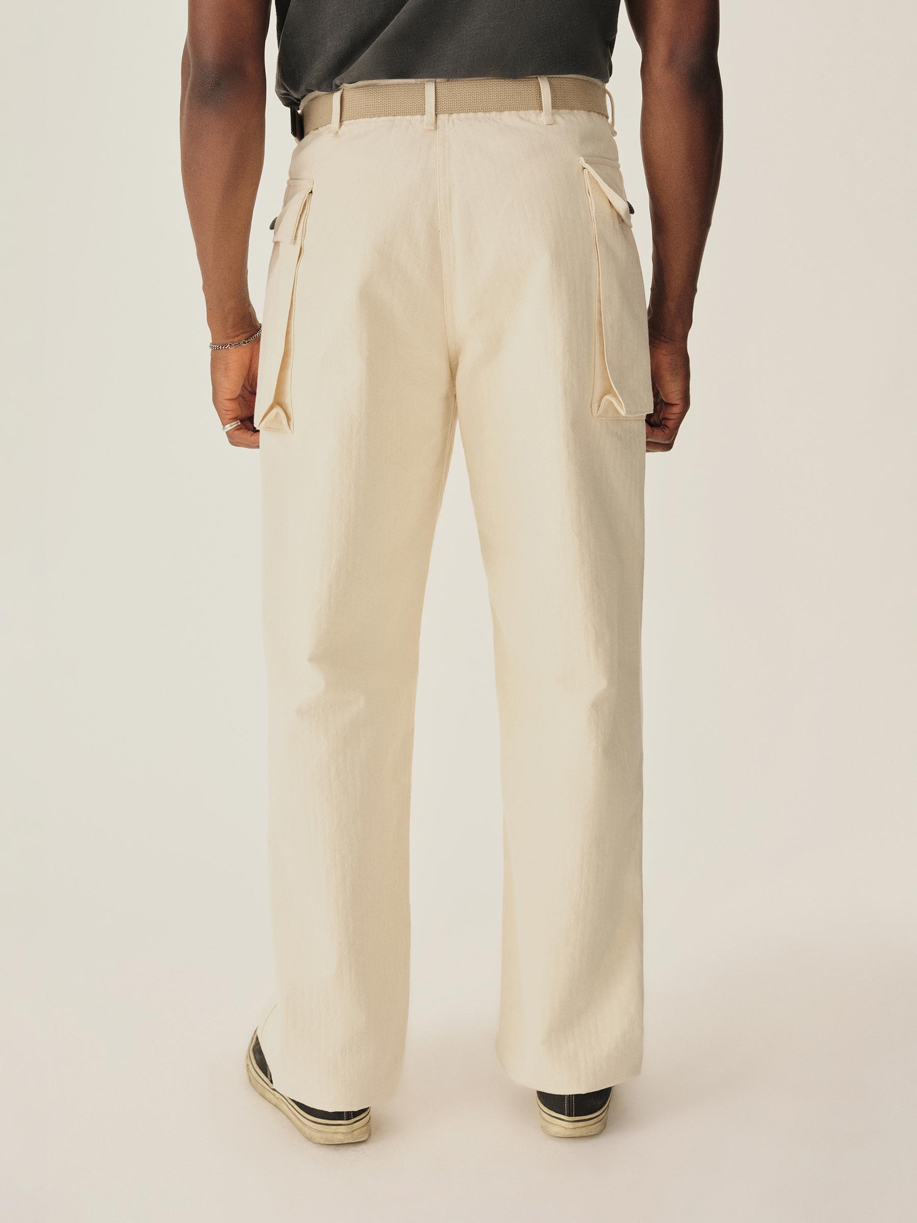 Inspired by the Herringbone Twill – or HBT – fatigue trousers worn by the US Army in WWII, these pants feature two cargo pockets high on the hips, close to the waistband. The pockets are made with an expandable gusset that allows them to keep a low profile while still being able to stow anything you need. The fit is relaxed with room in the leg and seat to accommodate the side pockets. The buttons are metal tack buttons featuring a 13-star design on the top – one for each of the original colonies.