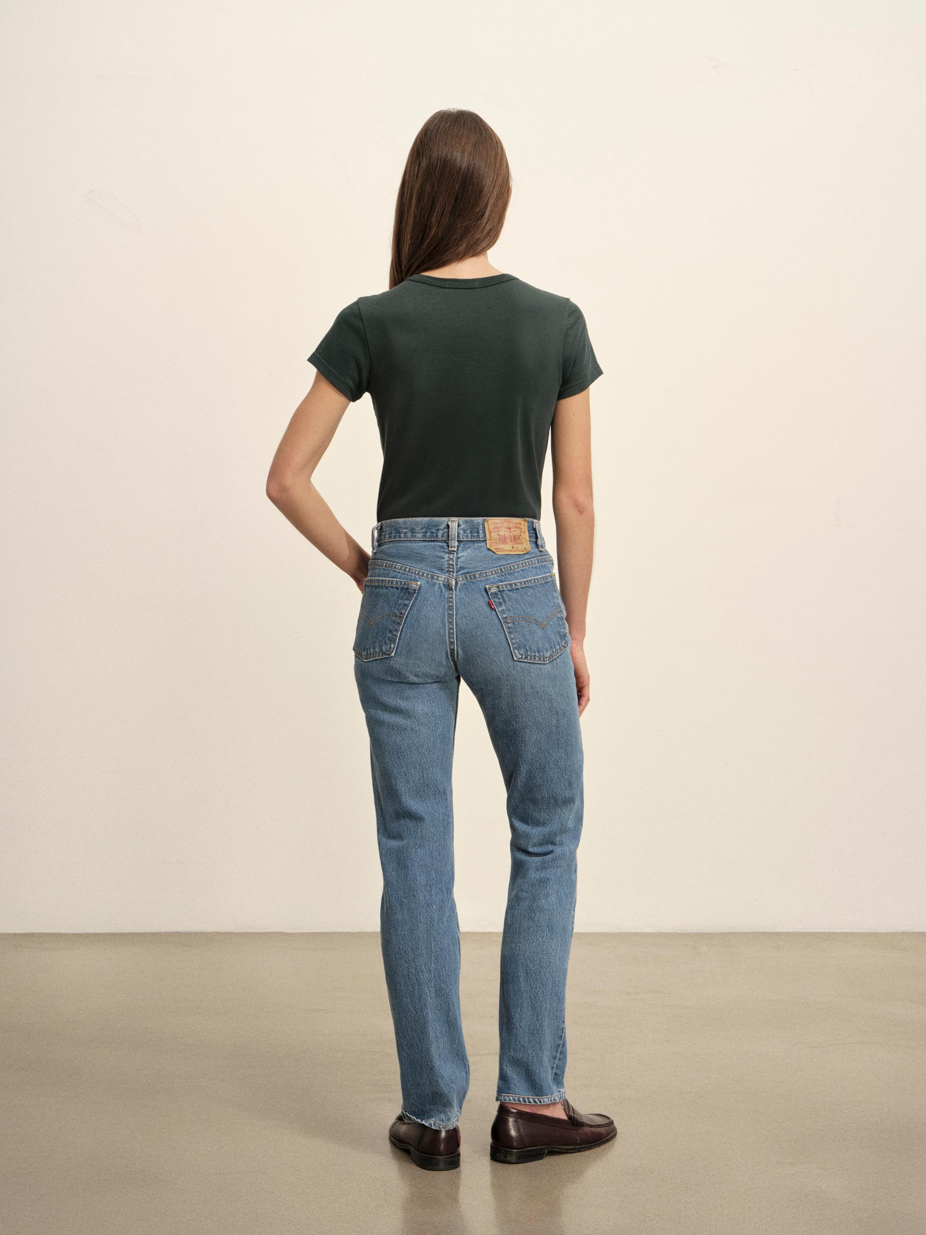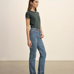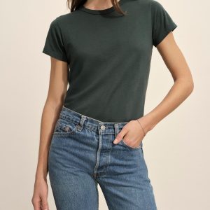 Slim fit short sleeve crewneck tee with a straight hem in 120 GSM jersey, knit from long-staple Supima cotton. Constructed with a durable rib stitch collar and double-needle cover stitch hem. Garment washed with softener for a lived-in feel.