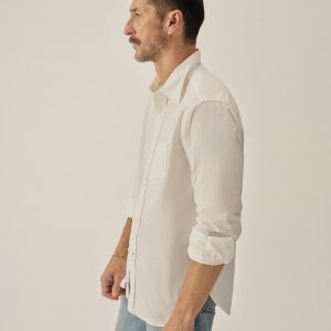 Classic fit button down collar shirt cut from a featherlight 3 oz cotton poplin. Details include mother of pearl buttons, a single scallop pocket, and a box pleat at the back. Constructed with clean finished seams. Garment washed for a lived-in look and feel.