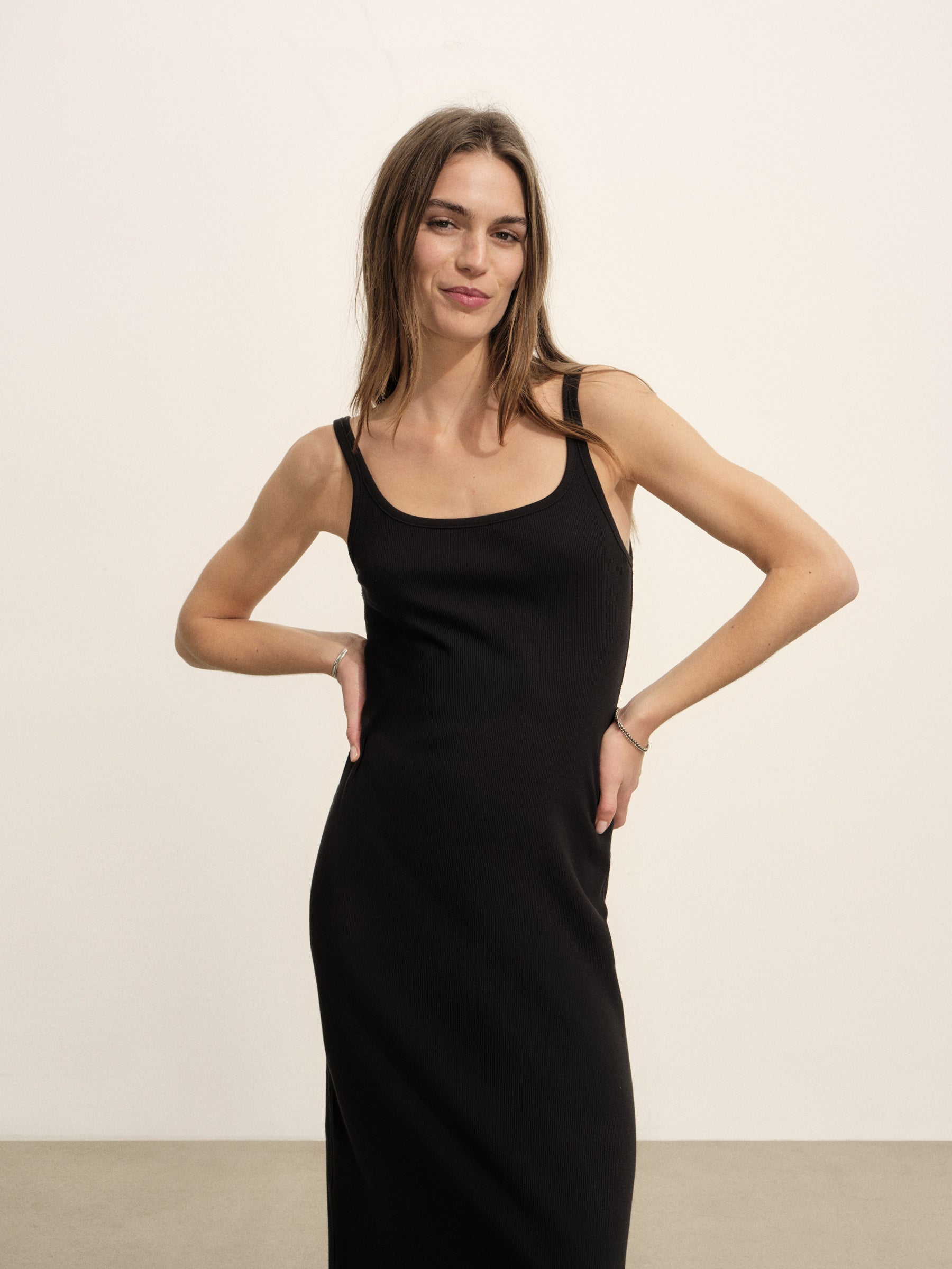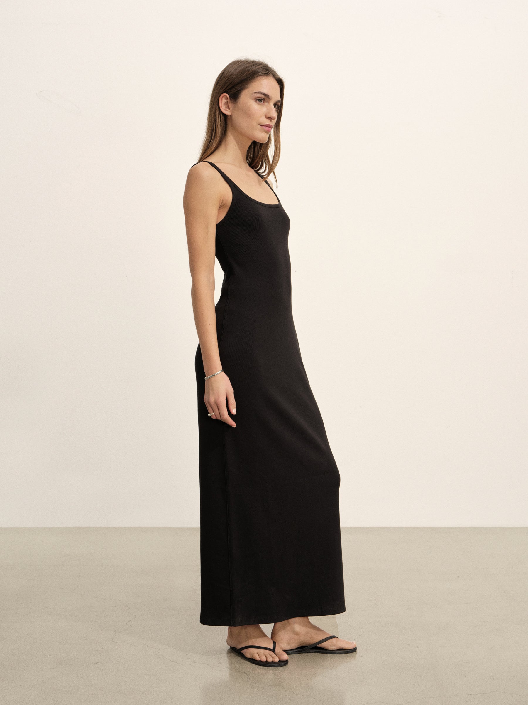 Slim fit ribbed scoop neck tank dress that’s fitted to the waist, then relaxes to hit below the calf in a 54” length. An easy, flattering silhouette in 295 GSM stretch cotton that holds its shape. 2×2 rib structure—two rows of rib stitch, two rows of jersey stitch—is offset by contrast 1×1 rib at the neck. Constructed with coverstitching throughout and flatlock stitching and godets at the side seams for extra volume. Garment washed for a lived-in feel.