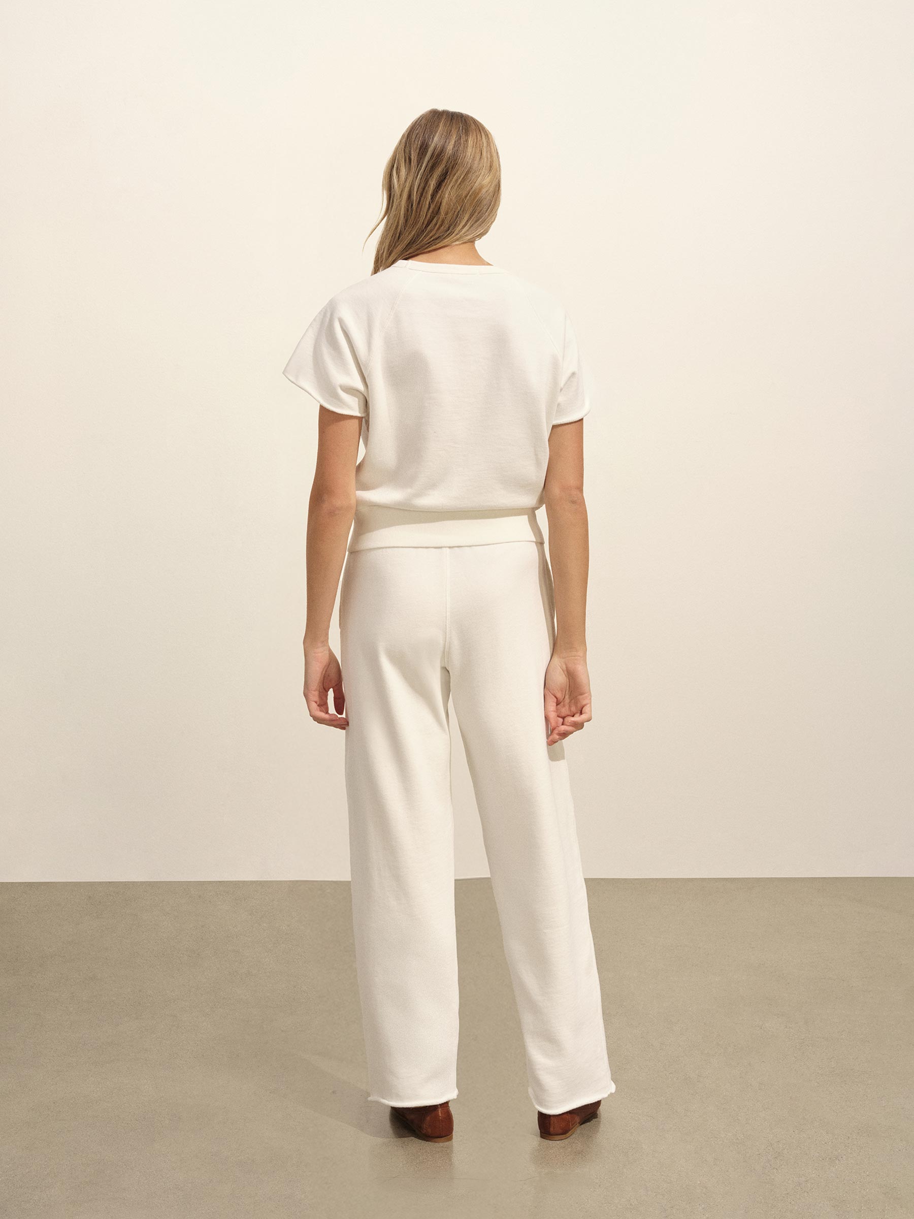 A modern nod to classic athletic wear, this wide leg sweatpant is cut from 100% cotton towel terry with a substantial 360 GSM weight. Piece dyed and polished, the fabric delivers a soft, broken-in feel with rich, dimensional color. The fit is relaxed through the hip and leg, with a 29 ½” inseam for an easy drape. An internal tunneled elastic waistband offers all-day comfort, finished with a woven contrast lining for a quiet hit of structure. Designed to move easy and wear even easier.