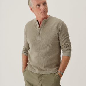 Classic fit thermal long sleeve henley with a straight hem. This 250 GSM French rib cotton double knit features a waffle-knit face and a smooth jersey back. Details include a woven three-button placket and corozo buttons. Constructed with ribbed cuffs and flat-lock stitching throughout for improved comfort and durability. Garment washed with enzymes and softener for a lived-in feel.