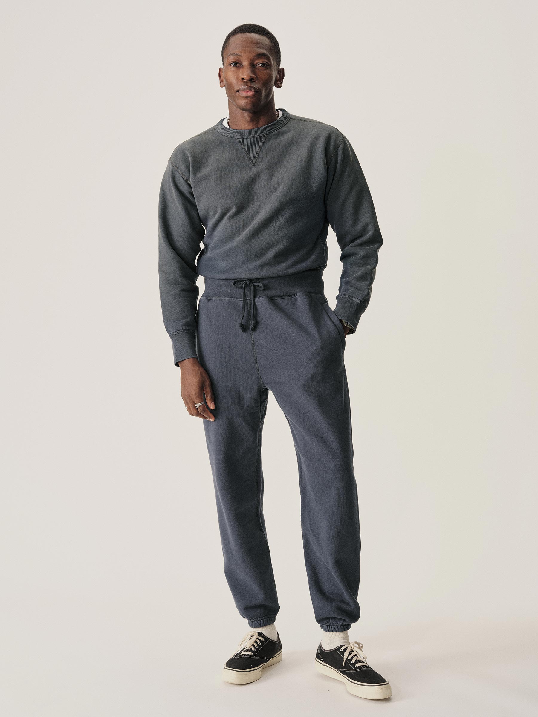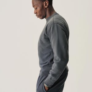 A midcentury-inspired crewneck sweatshirt made from plush, not-too-heavy, not-too-light, welterweight French terry. Features a “V” detailing at the front and back neck opening that was commonly found on sweatshirts from the 1940s and 50s.