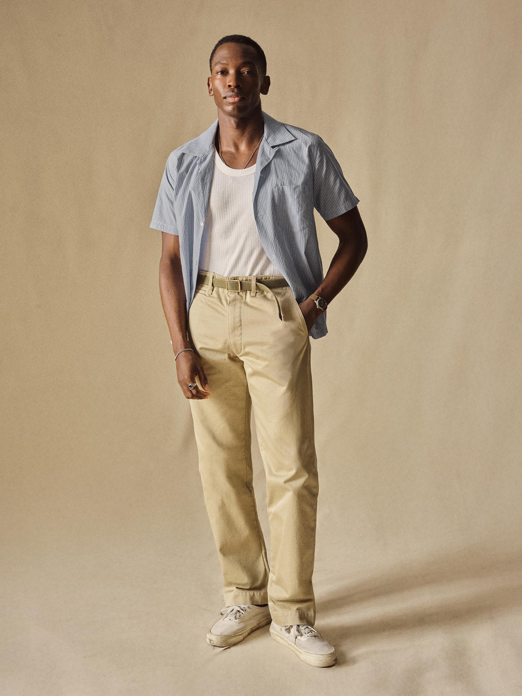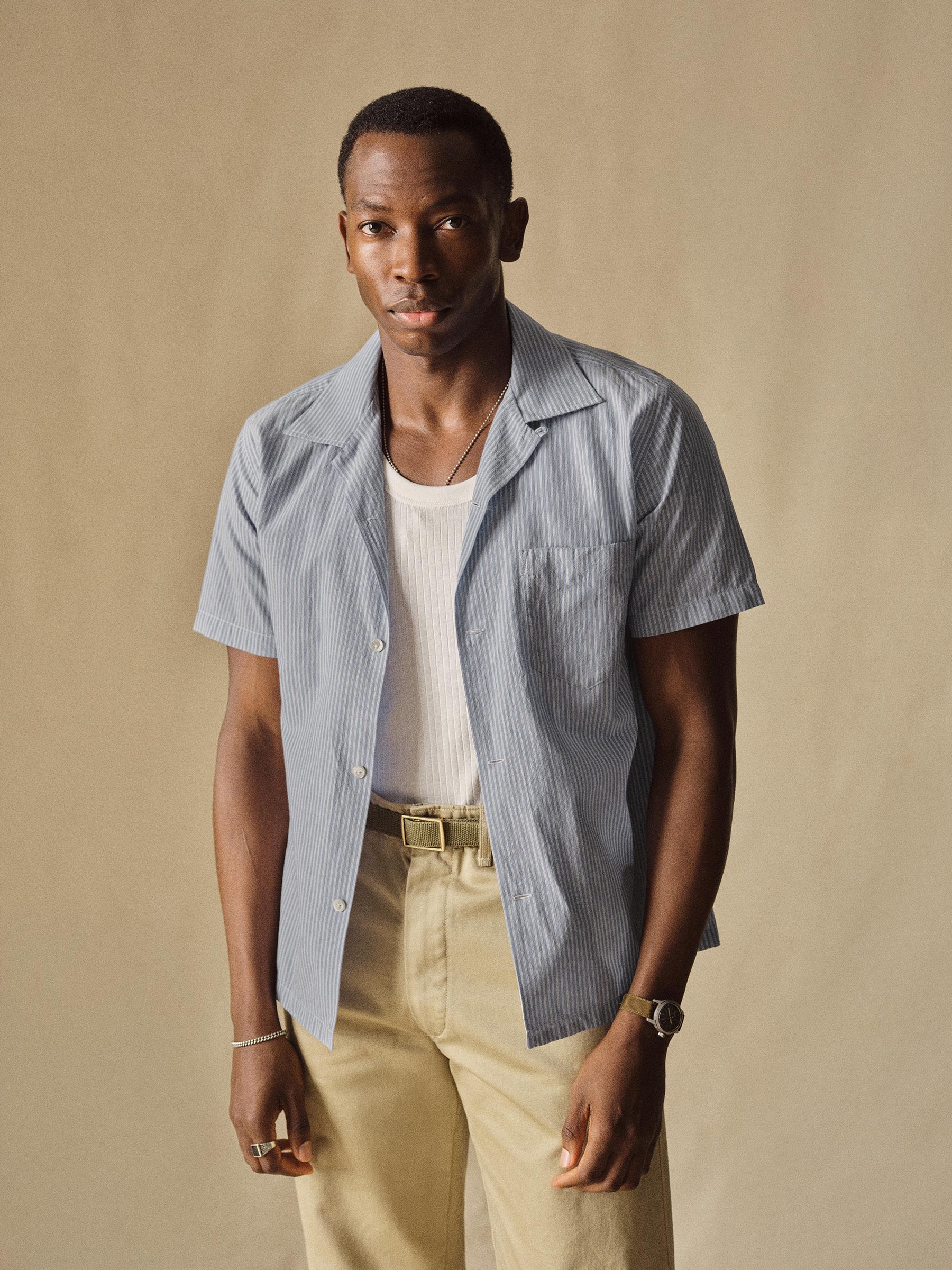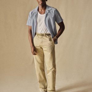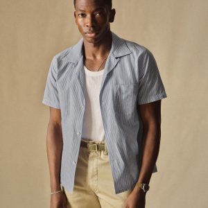 Classic fit short sleeve camp collar button up cut from a mercerized 4 oz. washed cotton. Features a four-button placket with mother of pearl buttons, a single spade chest pocket, and a loop and button closure at the neck. Constructed with clean finished seams. Garment washed with enzymes for a lived-in feel.